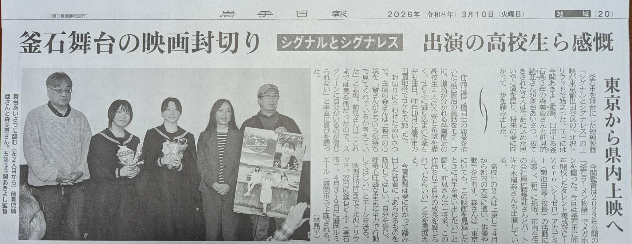 岩手日報に、東京・下北沢トリウッドで行われた映画『シグナルとシグナレス』の舞台あいさつの様子が掲載されました!